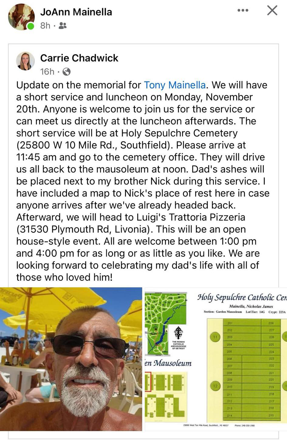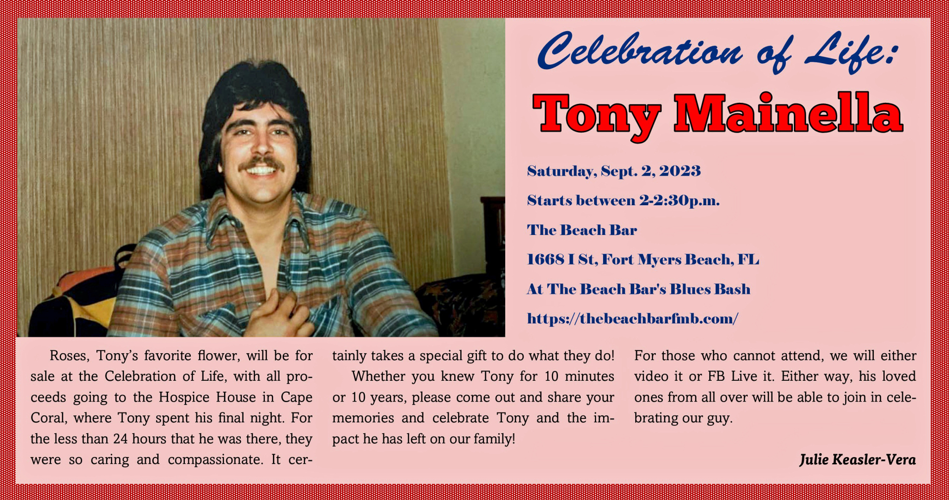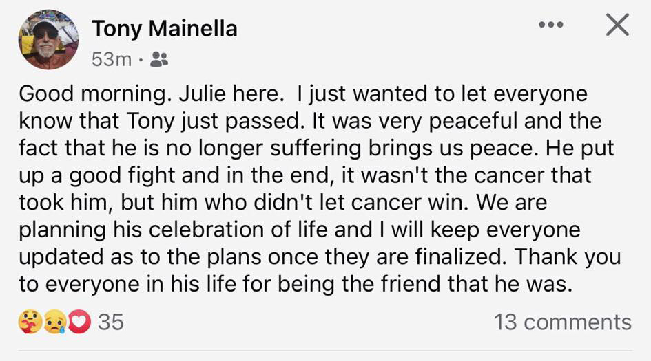 Aug. 22, 2023: TONY MAINELLA UPDATE: I’ll post funeral details once they’re available. May he rest in peace.