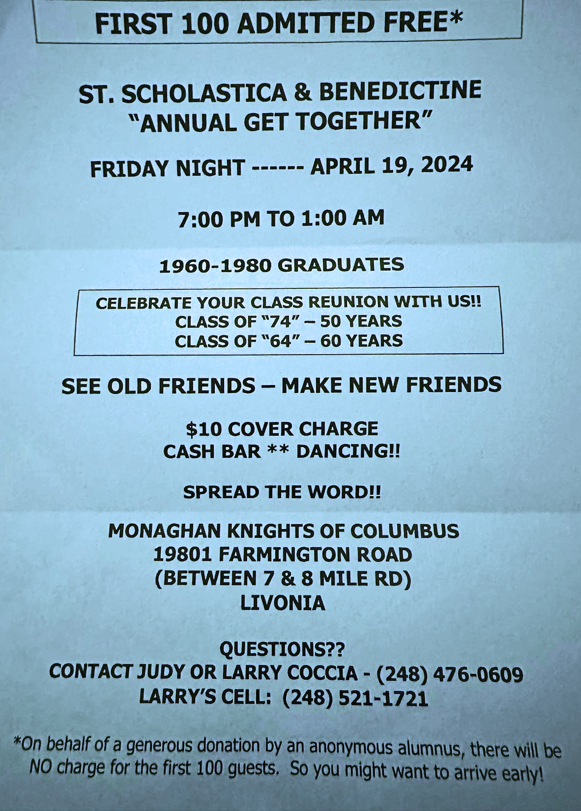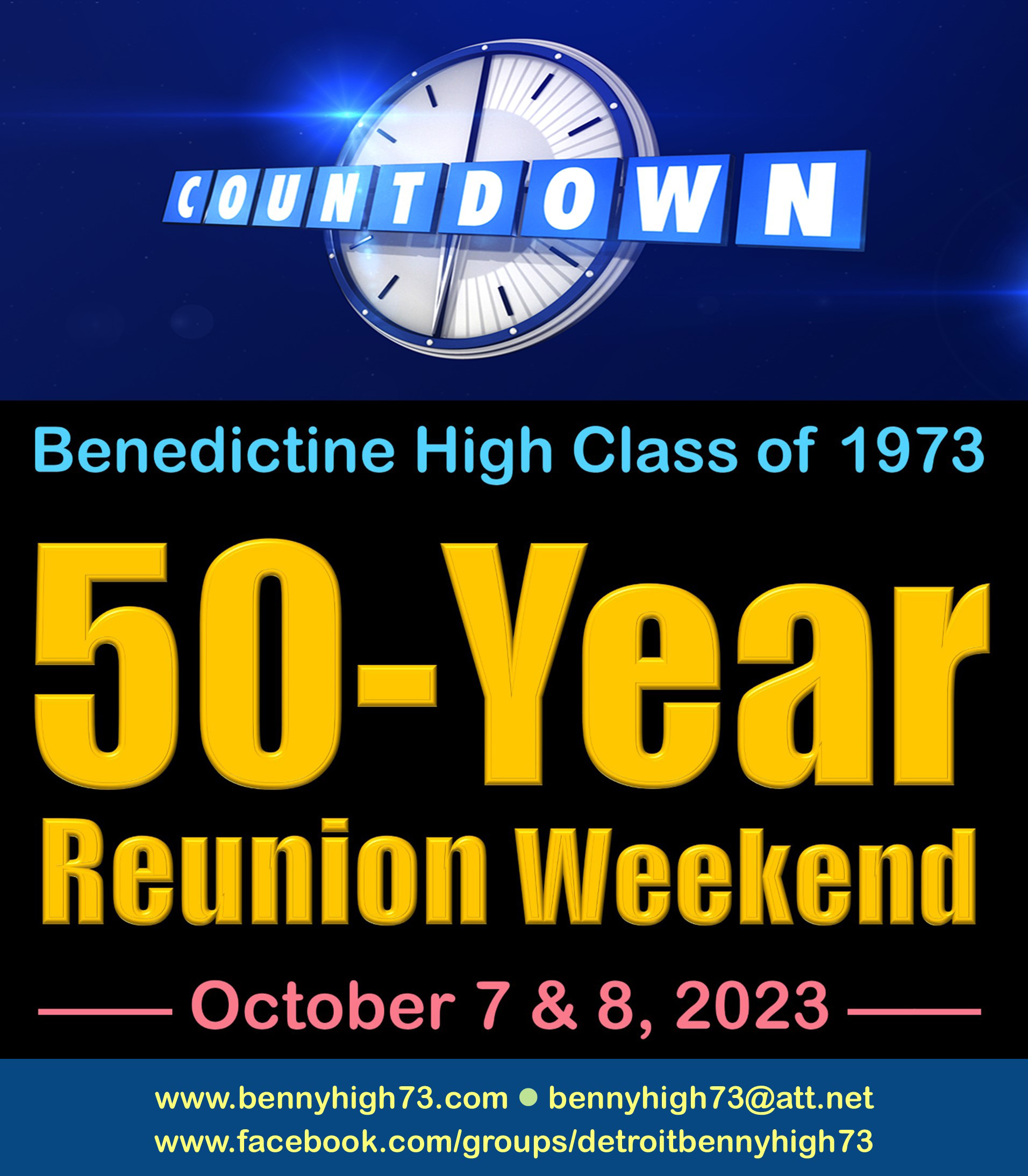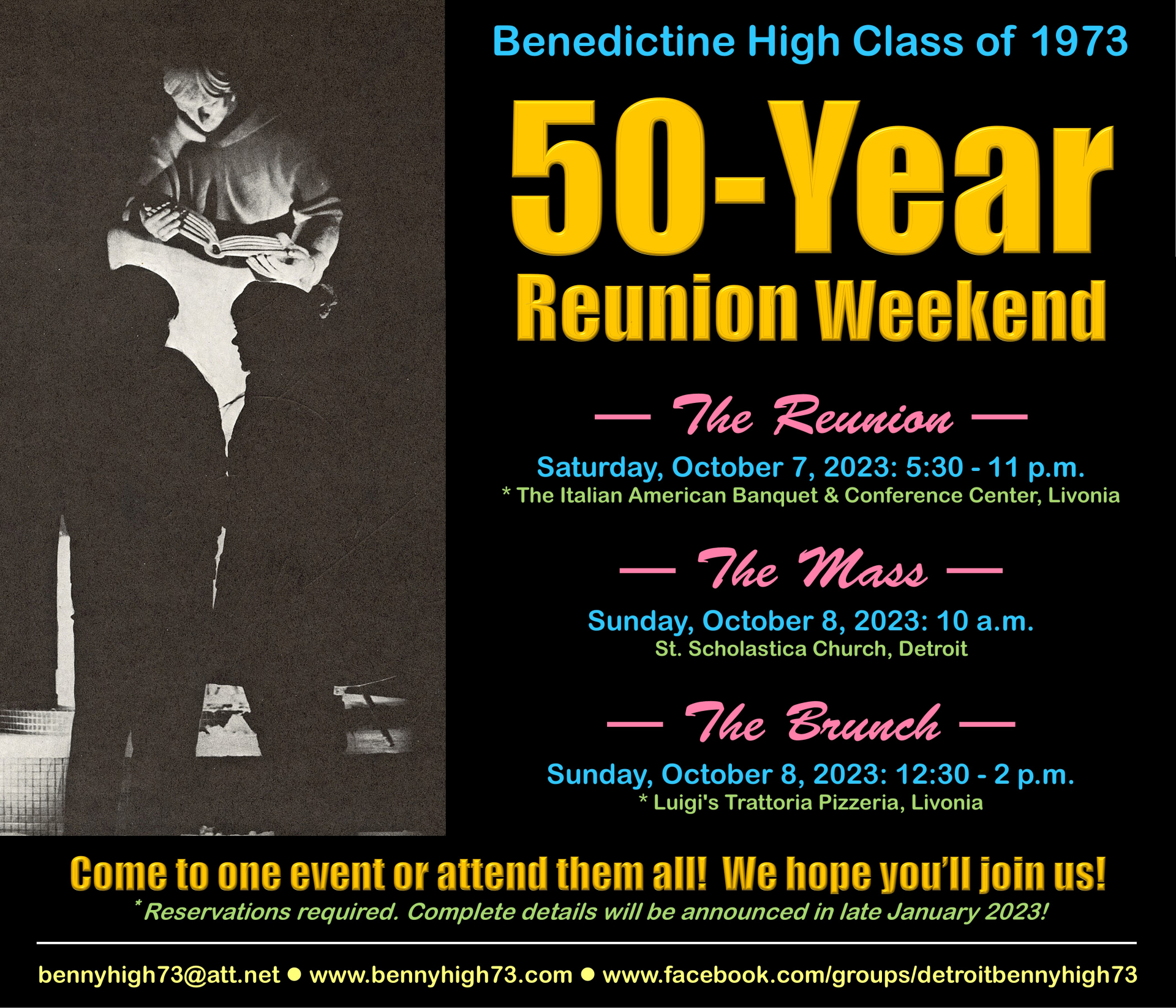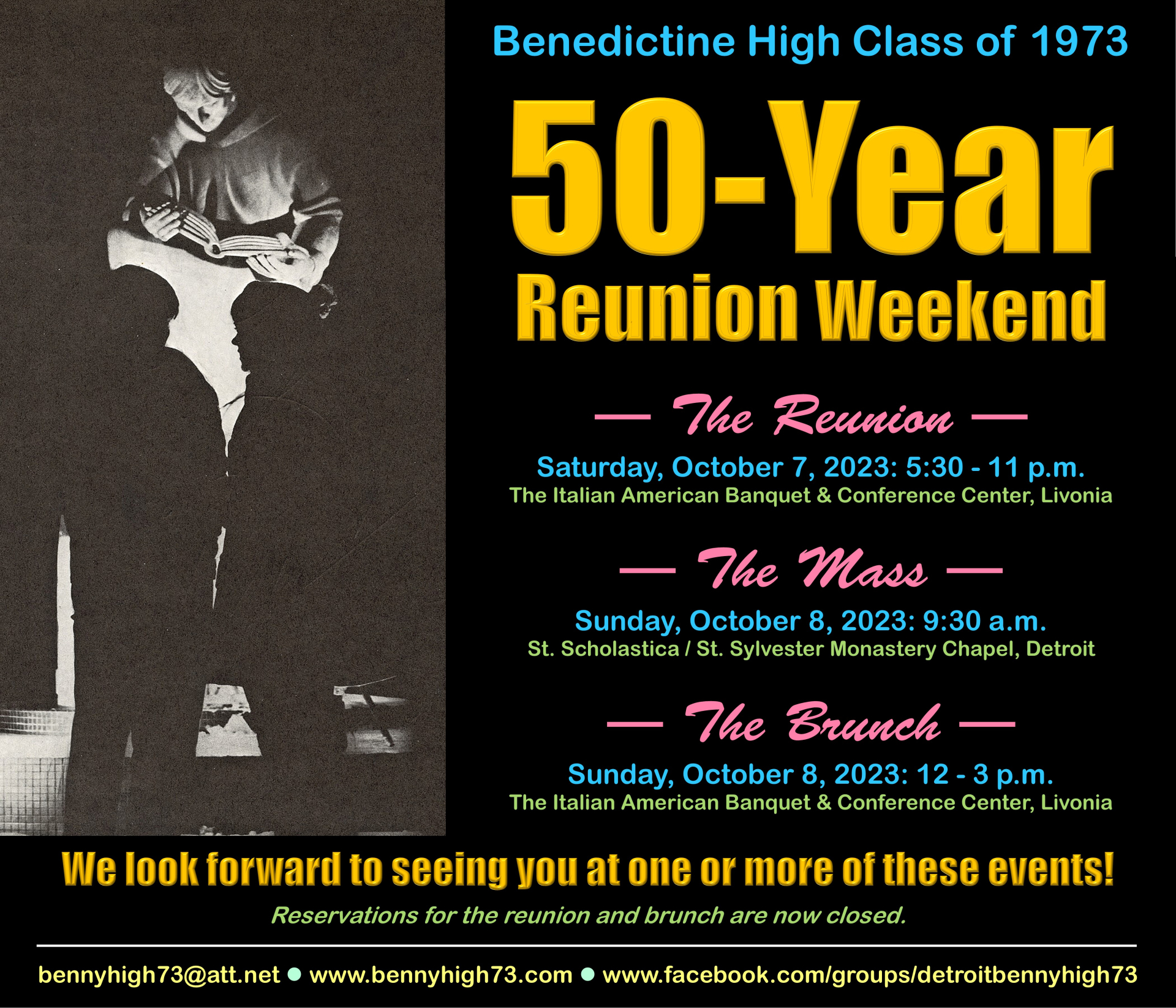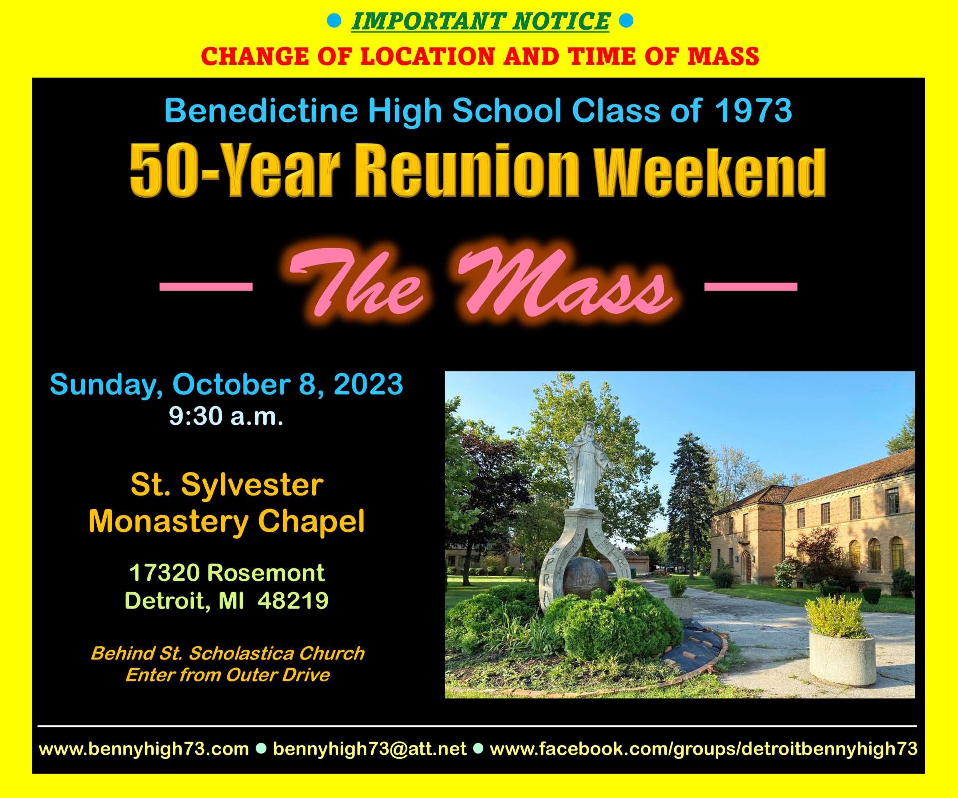 Sept. 9, 2023: In this week's episode of "A Benny High '73 Minute," Pastor Jim Lowe invites our class to "come home" to St. Scholastica on October 8. IMPORTANT NOTE: Because of a conflict, the time and location of our Sunday Mass have changed slightly. Please watch the full video for complete details.