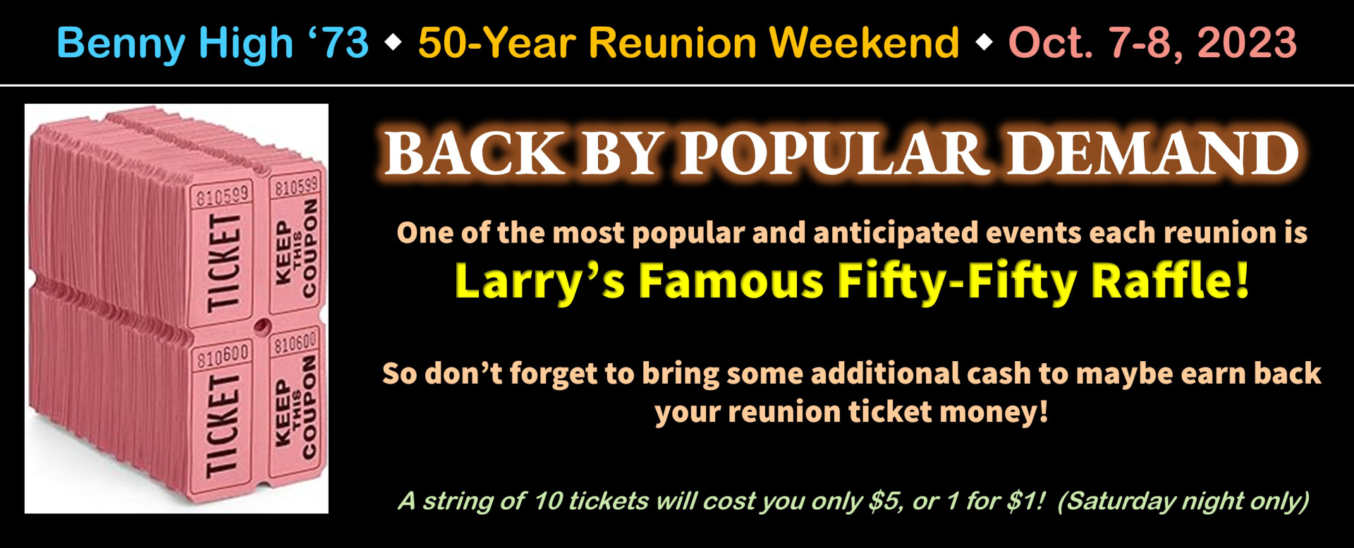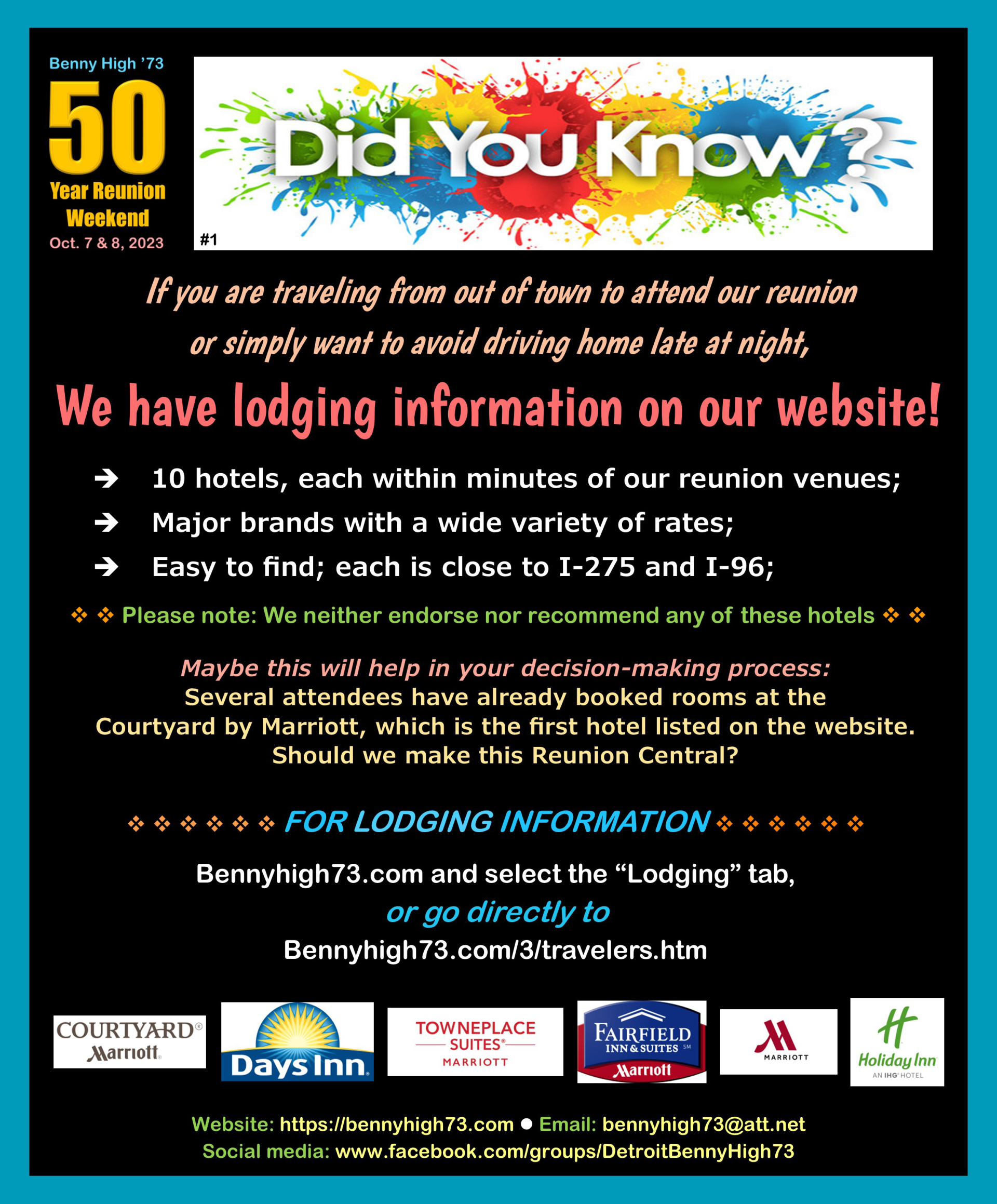 Sept. 4, 2023: Do you live out of town and are thinking of attending the reunion? Or are you planning on coming to both the Saturday and Sunday events but don't want to drive home Saturday night? See what Mary Hall LoCasio suggests in this latest episode in our series of short reunion videos, "A Benny '73 Minute!"