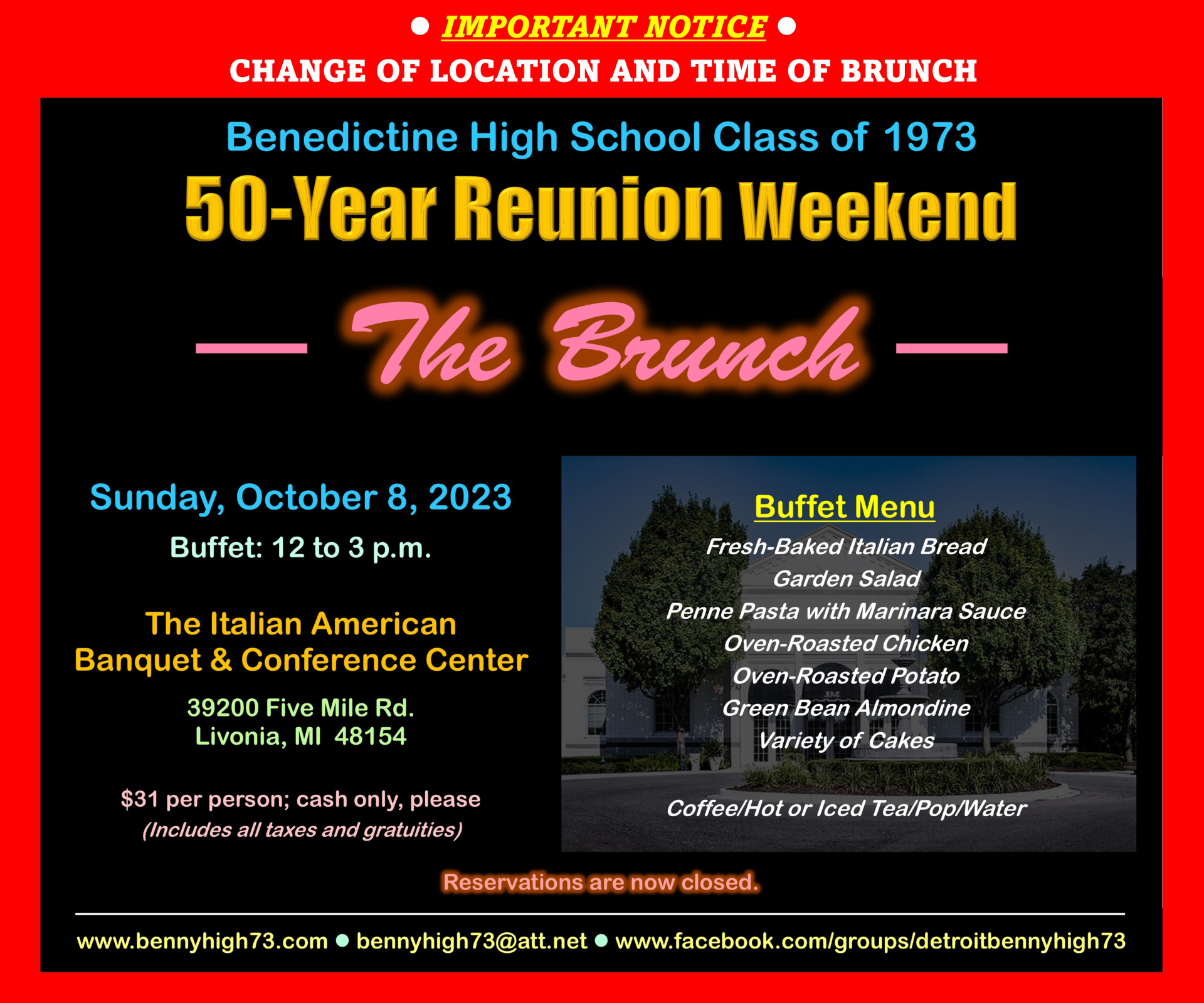 Sept. 18, 2023: Based on reservations as of Monday morning, our 50-year reunion will be the best attended of them all, with 90 signed up so far - many of whom never attended a past reunion or haven't joined us in decades! (And we're up to 44 at the brunch!) So here's your last chance to join in the fun!