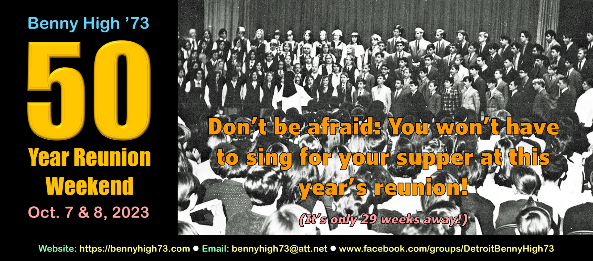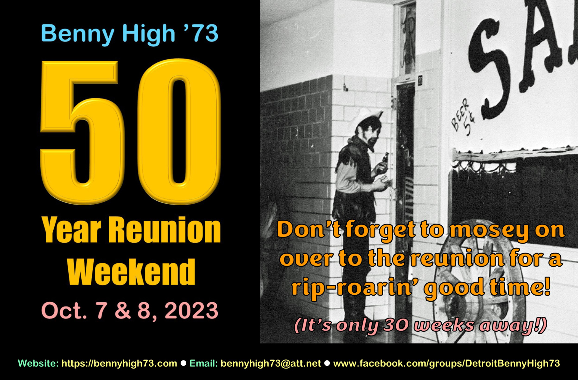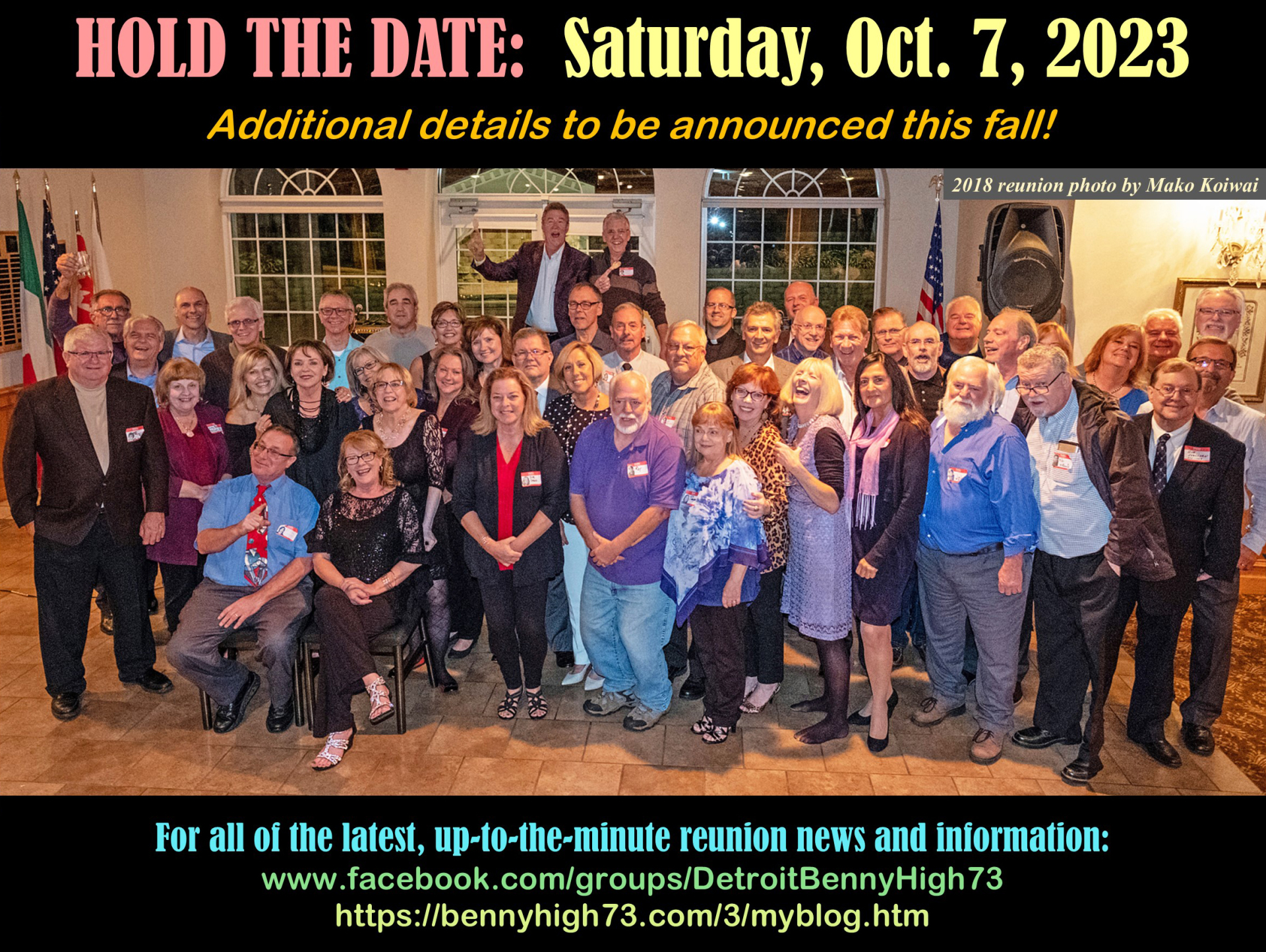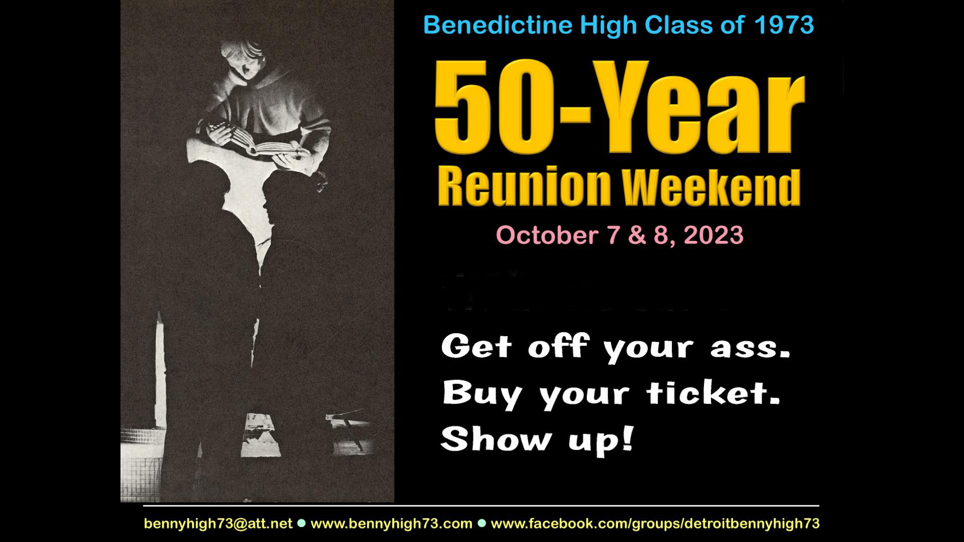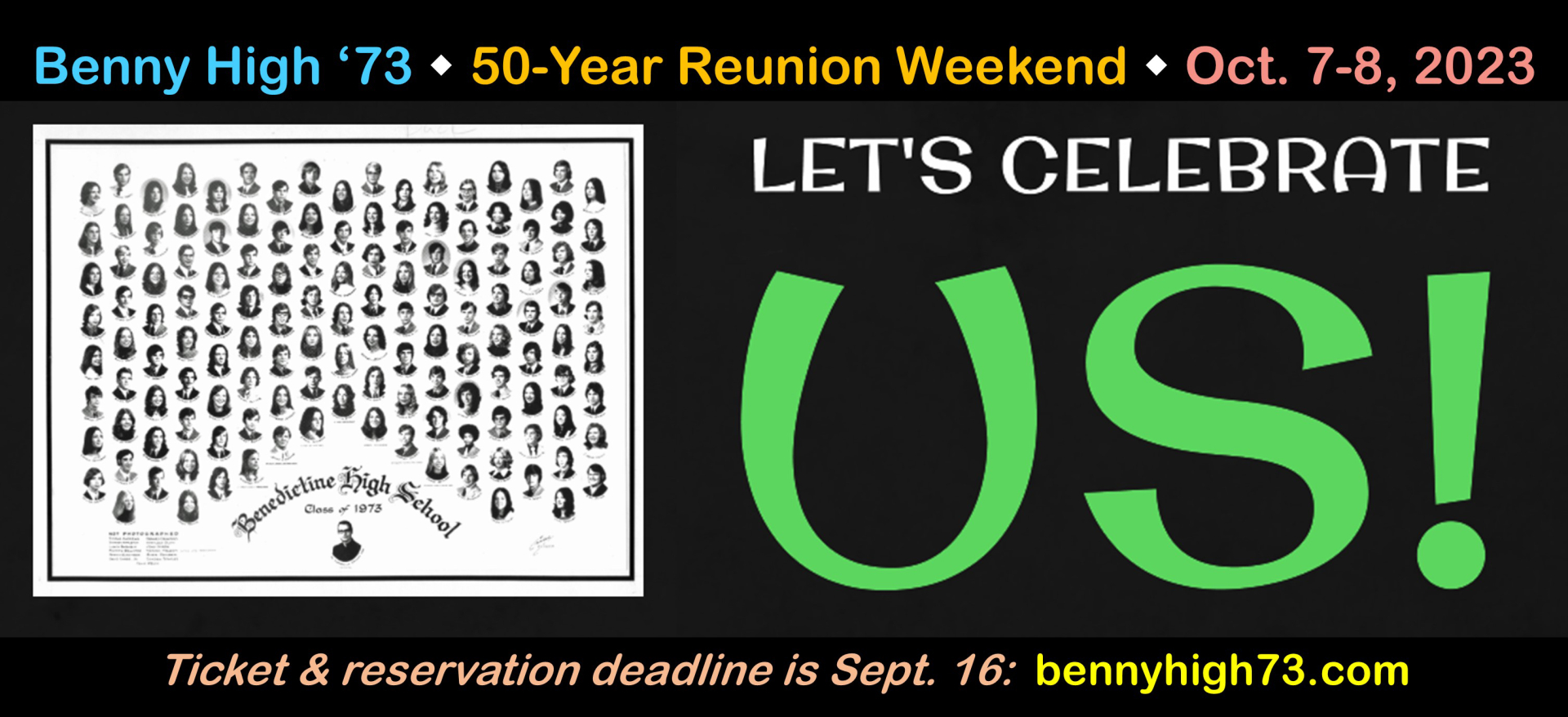 Aug. 19, 2023: We're not sure how to top Bill George's smash-hit 11-part extravaganza, but we're gonna try with this new series of short videos featuring members of the reunion committee discussing a different reunion-related topic each week! And so to get things rolling, here's Episode 1 of "A Benny '73 Minute" – and guess who it's hosted by? (Ahem!) Enjoy!