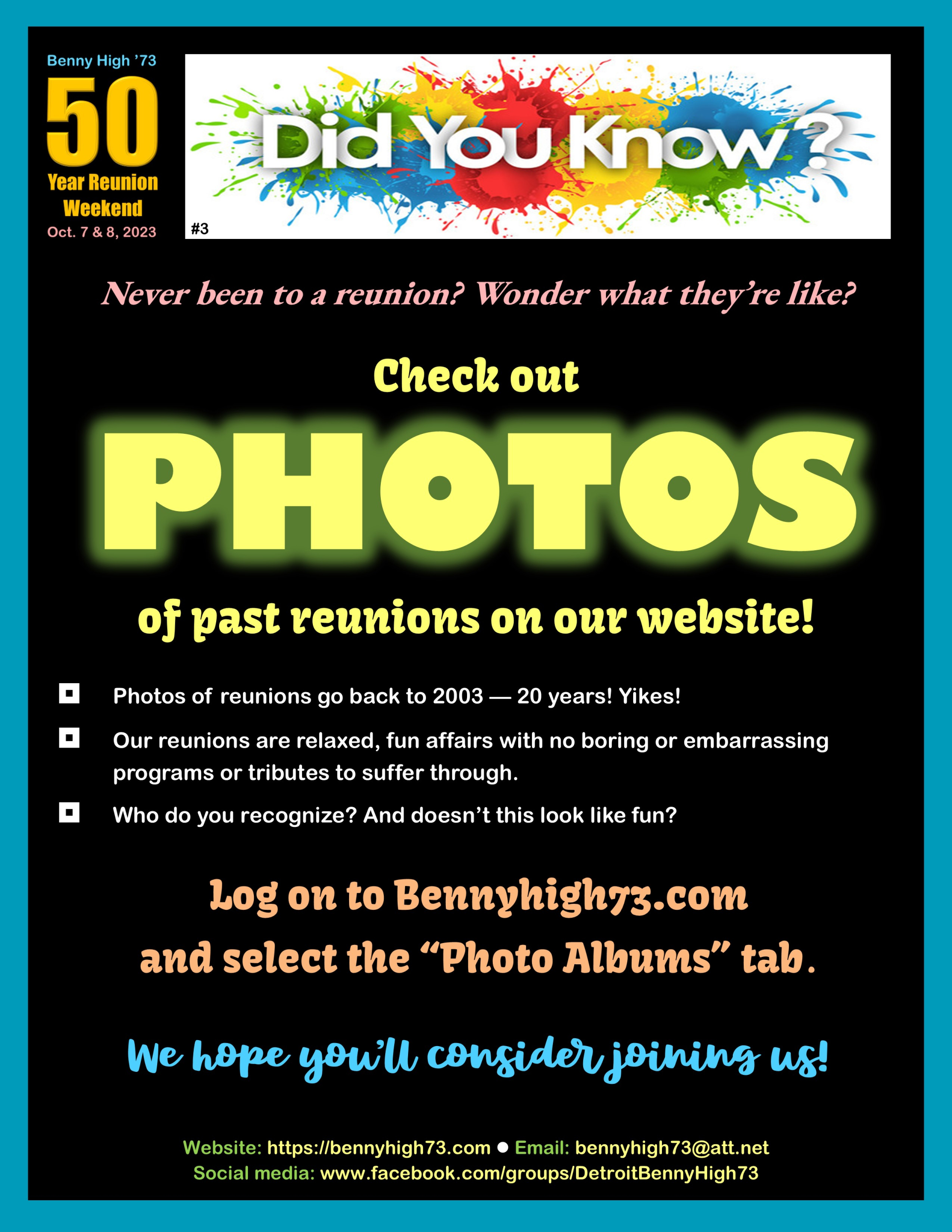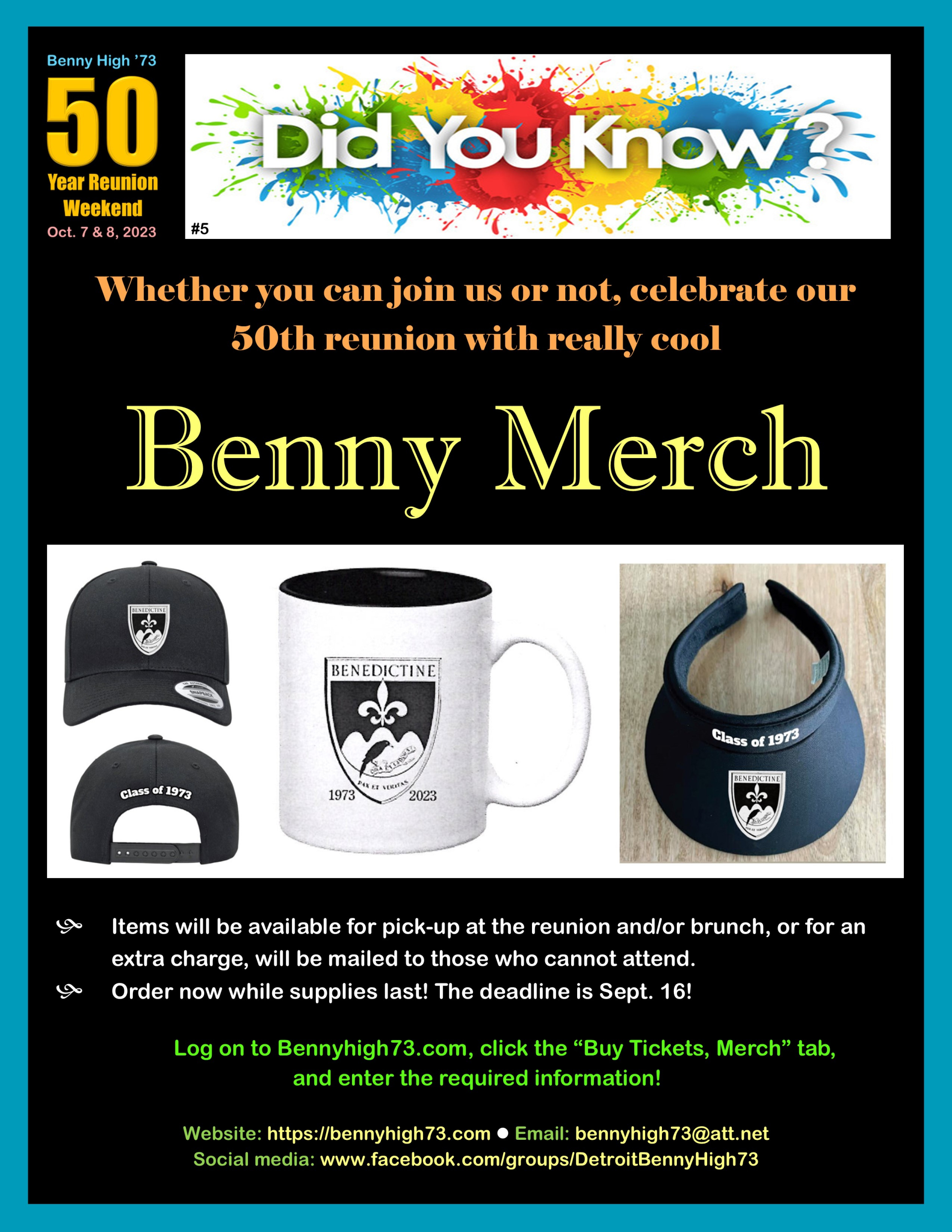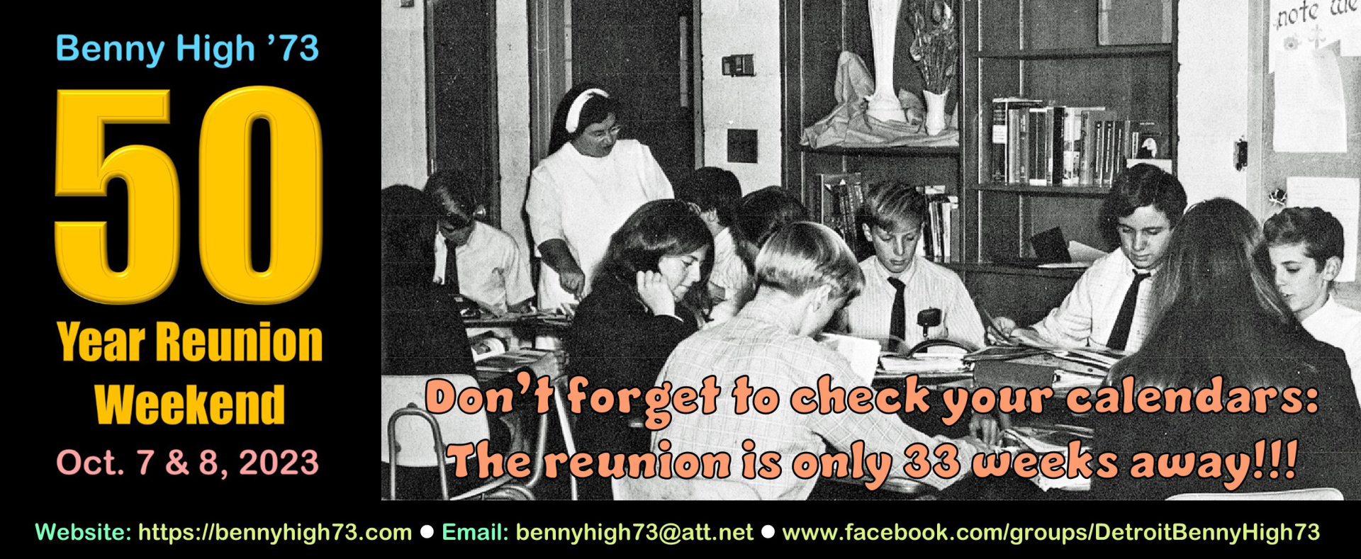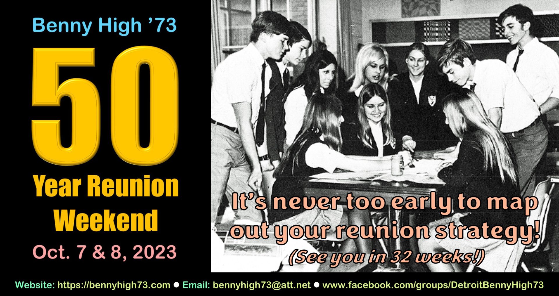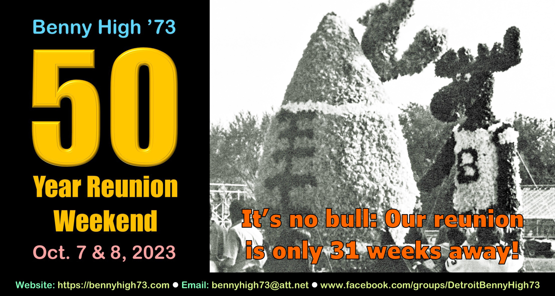 Aug. 19, 2023: We're not sure how to top Bill George's smash-hit 11-part extravaganza, but we're gonna try with this new series of short videos featuring members of the reunion committee discussing a different reunion-related topic each week! And so to get things rolling, here's Episode 1 of "A Benny '73 Minute" – and guess who it's hosted by? (Ahem!) Enjoy!