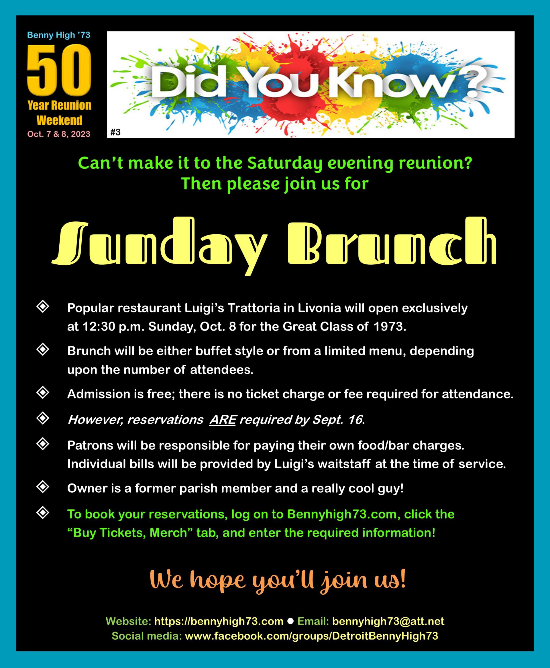 Aug. 31, 2023: To purchase reunion tickets, make brunch reservations
