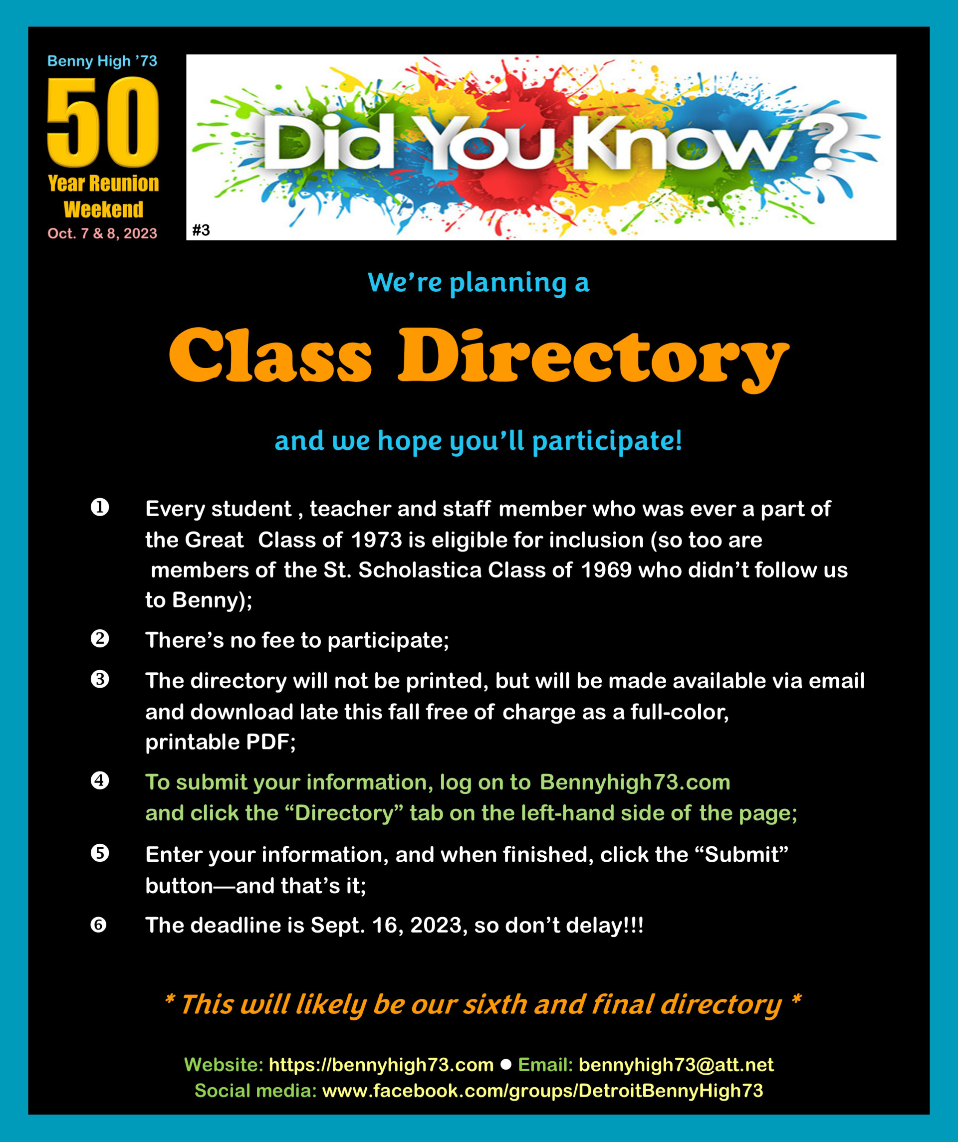 - THEN simply send me a FB Message or an email to bennyhigh73@tt.net by JANUARY 16, 2024 – and if there’s enough interest, we’ll gladly add the extra pages. I’ll then contact you with instructions on how to submit the information.