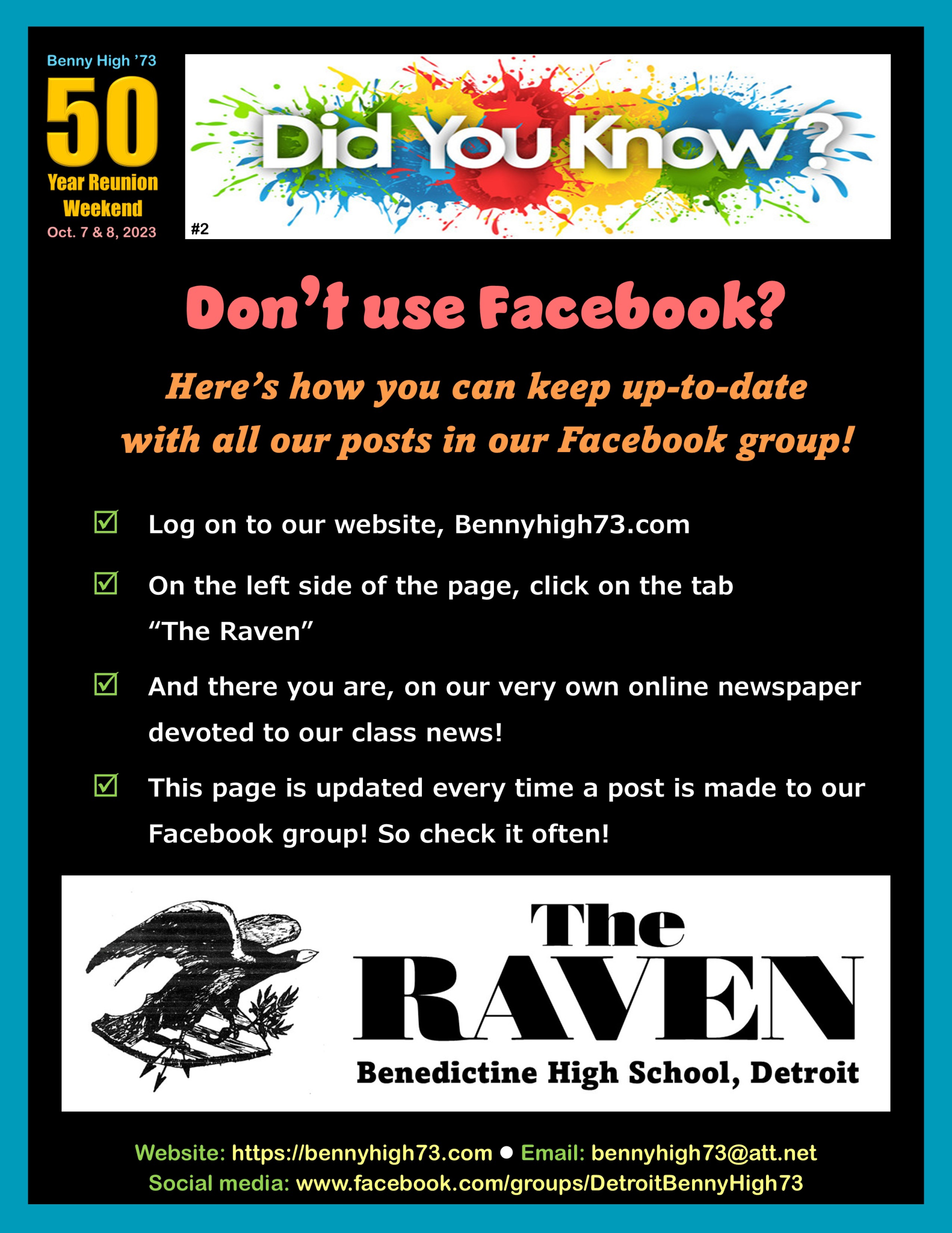 Yes, The Raven has returned! Not as an old-fashioned newspaper, but as a 21st-century blog to keep our classmates up-to-date on the details of our 50th Reunion scheduled to place in Early Fall 2023. Because we know not all of our classmates are on social media, all of our announcements will be simultaneously posted both here and on our Facebook page to allow greater access to all of the latest and up-to-the-minute reunion news and information. So don't forget: Please check here regulary now until our reunion!