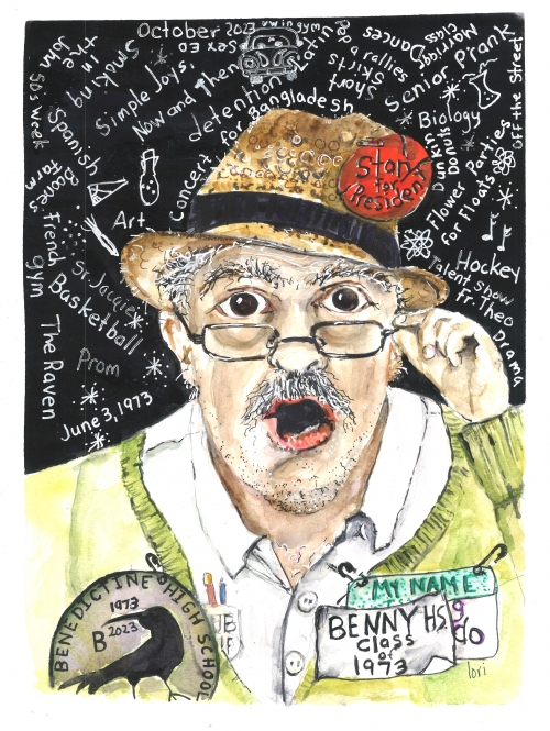 We are grateful to our classmate, Lori Radovic Hohmann, for illustrating our high-school years’ benchmark on the reunion-announcement brochure. And acknowledge Don Calamia’s creativeness on compiling a video about our Benny yearbook – as you know, “Every Picture Tells a Story” (Rod Stewart)